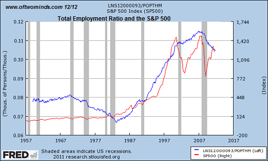 Another Reason for Stocks to Tank in 2012: Jobs (December 8, 2011) Though nobody seems to notice, stock prices are correlated to employment, which is trending down. The Federal Reserve would have you believe that Monday morning ramp-and-camp and rumor-mill rallies in the last five minutes of trading are signs of a healthy Bull market. Or you can consider the reality of these charts. Not unsurprisingly, employment is correlated to the stock market. If lots of people have stable fulltime work, then they're earning enough money to generate a surplus that flows into the market via IRA and 401K retirement plans and other accounts. Conversely, if few people have stable fulltime work, then few households can generate a surplus to put in the market. Instead, households short of cash will be removing money from their stock accounts. Courtesy of longtime correspondent B.C., here is a chart of total employment per capita (in blue) and the stock market (in red), represented by the broad-based S&P 500 adjusted for inflation with the official metric of inflation, the CPI (consumer price index).