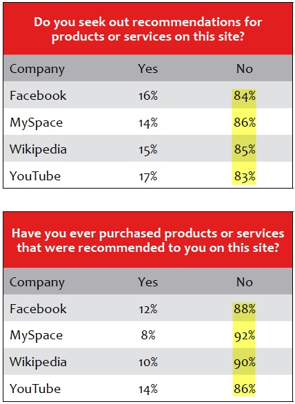 The big hype in social media is exploiting the trust implicit in "friending" for profit. This will degrade the very trust the marketing seeks to exploit. So not only is Facebook unable to charge its users or charge a premium for adverts when its free services are so much cheaper and more effective, the "platform" itself will intevitably be degraded by the relentless counterfeiting of "friends," "likes," etc. which have created its supposed "value" as a platform. As the chart above illustrates, most Web users disregard banner adverts, and this poses a problem to both the social media companies and their potential advertisers: how can they break through the marketing clutter which most users tune out? If social media companies fail to offer adverts which actually work for their advertisers, then they won't be able to charge premium rates for ads. Facebook collects significant revenues from purveyors of online services and games such as Zynga's FarmVille, but the big money is in advertising--a field that both Twitter and Facebook are still exploring. Facebook is attempting to make use of its vast user base in tailoring ads which are not just contextual to the content but to their social context. When somebody writes about their mortgage on their blog or Facebook page, then the search engine will place an advert for mortgage rates on that page: that's contextual placement. The social-context ads, which Facebook introduced about a year ago, are based on data it collects on the "likes" and networks of friends of its users. These social-context adverts appear on the right side of a user's homepage, and along with the ads are the names of any of the user's friends who previously clicked that they like the brand or advert being displayed. Users can then click a button to add their "like" to the ad or brand. The basic idea is to enable the gold standard of marketing: word-of-mouth. Despite all the studies, metrics, and innovations, successful marketing campaigns are still largely based on good old word-of-mouth. Thus the hope for social media companies and their advertiser alike is that the global networks of friends and colleagues assembled in Twitter, Facebook and other social media leaders can be used to spark successful word-of-mouth campaigns. Two challenges have emerged to this "stimulate word of mouth" strategy: one is the inherent ambiguities in tracking the effectiveness of any such campaign, and the second is that marketers and promoters are busy exploiting the trust and loyalty which are the foundations of social networks. The metrics of online media is so important to the Web that an industry has arisen to fulfill that mission, and a professional conference, the International Conference on Online Media Measurement, was recently held in Lisbon, Spain. One attendee was David Tiltman, a journalist who has covered the field for years. Tiltman concluded that the industry has no standard metric to measure "buzz" (word-of-mouth) or effectiveness and thus advertisers are bombarded with terms such as "engagement" and "conversation" rather than meaningful metrics. A number of companies have sprung up to measure the "buzz" created by ad campaigns on social networks. According to Tiltman, "When one delegate asked five different word-of-mouth measurement companies to track his Superbowl ad, he got five different responses. These services sell themselves as tracking tools, but actually they are hugely reliant on human input to categorize brand mentions on social media." In other words, counting friends or clicks is not a very useful metric. Canny marketers are also busy inserting counterfeit "friends" and product placement into social networks, undermining the very trust they seek to exploit. One way marketers seek to influence social network users is to inflate the number of "friends" and Twitter followers by purchasing thousands of friends and followers online. They also deploy Sponsored Tweets and paid referrals—users are paid to re-tweet Tweets promoting some brand or advert—to create what is in effect a fake word-of-mouth campaign that will supposedly ignite a real word-of-mouth buzz. This dilution and exploitation of social networks may well cause users not to trust any marketing they see on social networks, which would lower the value of social media to advertisers and marketers. Tiltman described a conversation with a big-name advertising client who was wary of such a metric-free, easy-to-game environment: "Without a proper currency online that allows some sort of comparison between media, he cannot advise heavy spend in digital." Companies deciding between traditional advertising campaigns which funnel revenue to the social media companies like Facebook and "viral" word-of-mouth campaigns waged via Tweets and inserting product placement in conversations between friends have little to go on. "It fundamentally comes down to why people are there on social networks. They are not there to read our ads. They are there to talk to each other," says Scott Monty, the respected head of social media at Ford Motor Company. Rather than spend millions on traditional ad campaigns displayed on Facebook, Ford uses the site's free options to assemble networks of fans who share photos and stories about their Ford vehicles online. The net result: potential advertisers will simply use the free tools these networks offer to market their products and services, leaving the social-media companies with little big-dollar advertising.