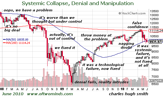 How? Consider: 1. The extreme levels of inherent risk in each system were downplayed/misunderstood by those responsible for their management. 2. The unprecedented risk intrinsic to each system was masked by facsimiles of regulation and specialized expertise. 3. The initial warning signs were dismissed, downplayed or ignored. 4. Each system was on the outer edge of human engineering (mechanical and financial) but was treated by regulators and managers as entirely standard. 5. Once the system collapsed, nobody knew how to fix it. 6. As the full extent of the damage became apparent, those responsible sought to mask the true extent pf the damage. 7. The mainstream media and elected officials unskeptically accepted prevarications, mis-statements, misinformation and manufactured facades as representations of the truth. 8. As the true extent of the damage, distortion/manipulation and failure of responsible authorities became undeniable, public confidence in government, regulatory agencies and the market irrevocably eroded. Here is a chart of the market with my notes. This basic pattern applies to Deepwater Horizon as well, only on a much shorter timescale.