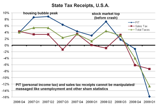 The chart is from a report (submitted by correspondent Dan K.) which has spread throughout the blogosphere (but not the MSM): April Is a Cruel Month: Personal Income Tax Revenues Portend Deepening Trouble for Many States (Nelson A. Rockefeller Institute of Government) Here is a report from the California Controller: Statement of General Fund Cash Receipts and Disbursements April 2009 Anyone who thinks the downtrend in tax receipts will suddenly reverse course should step away from the flickering screen of fantasy and re-enter reality. Personal income taxes bring in almost half of all California tax revenues; us plebian residents pay modest income taxes while high-income folks pay about 10%. Let's consider what generated all the big income which generated all the big tax revenues: Flipping real estate for huge capital gains: Gone, never to return. Huge stock option gains from tech and Web2.0 company insiders: Gone, never to return. Huge incomes reaped by realtors, mortgage brokers and other FIRE economy windfall exploiters: Gone, never to return. But wait, there's more: structural changes are gutting Hollywood, the music industry, tourism and the vaunted tech industry--the last props left now that the FIRE economy is reduced to cinders. Meanwhile, as those paying huge taxes go broke, downsize or simply pack up and leave, the Democratic "leadership" refuses to consider even a 5% pay cut for the state work force. Question for both parties' "leaders": where do you think you're going to find $8-$12 billion to fill the shortfall you're masking with tricks? Do you really think the FIRE (finance, real estate, insurance) economy will roar back from the ashes and generate $15 billion in new tax revenue in 2010? May I introduce a strange new concept, reality, to your calculations? Count on another $10 billion shortfall in 2010, not a $10 billion windfall. The transparency of their desperation to cling to the status quo is breathtaking: do they really expect the bond market to accept that a $25 billion deficit has been "resolved" with $11 billion in actual expense reductions, $2 billion in new taxes and $12 billion in accounting tricks? Who is willing to bet money (i.e. give California cash) that the state will not add to the remaining $12 billion deficit for this fiscal year with another $10 billion next year, and so on until the state finally defaults? Apparently not the Obama administration. As beholden as the Obama administration is to the unions and Democrats of California, they can discern the end-state of bailing out California: any bailout of the Golden State would be followed by 49 other requests for bailouts (as if the $787 billion "stimulus" package wasn't already a bailout of the states.) Even more dispiriting for the "leaders" of California, the realists in the Obama White House recognize that bailing out California in 2009 will require bailing it out in 2010, 2011, 2012, etc. A state which refuses to deal with a $25 billion deficit has no track record to suggest it will tear itself away from fantasy and political cowardice in 2010 or indeed, any year. The bond market might just decide enough is enough and refuse to lend money to California to paper over its $8-$12 billion deficit for 2009. Then the state will have no choice but to default on some of its obligations. The clock is running, as the state controller has said that California will run out of cash within 50 days. If you look at the trendline in the chart above, that appears to be an overly optimistic assessment. I would hazard a guess of 30 days, max, before implosion. People like to say California is like a nation itself--and in terms of size, population and GDP, it is like a nation: the nation of Zimbabwe, another failed state with failed "leaders."
