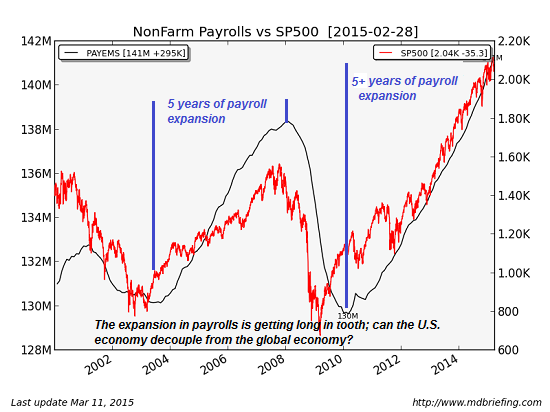 1. Can the U.S. economy decouple from the global economy, i.e. keep expanding production, sales, income and payrolls while the rest of the global economy falters?