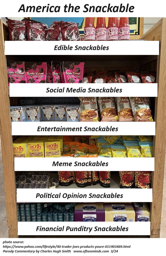 The enormous profitability of edible snacks is mirrored in all the other manifestations of America the Snackable: our daily lives are now composed of one bite-sized addictive snack of social media, novelty memes, political opinion, financial data-snacks and pundits' opinions and snackable videos after another.
