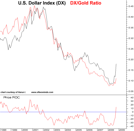The recent stories of people not wanting to open their 401K statements and the observation that $10 trillion in nominal gains in the US equity markets being wiped out in the past two months may be real but they are misleading. Much more actual wealth has been wiped out and has been ongoing since 2003 as indicated by the Dow/Gold ratio. For those afraid to look at 401K statements, you are 5 years too late; the market is just beginning to catch up to reality.Thank you very much, Harun. It seems to me the key takeaway is that in relation to gold, all these currencies have declined in value/purchasing power. Thus a fleet-footed trader could have exchanged one currency for another at various points in time (or shorted one currency and gone long another) and still come out ahead in terms of the amount of gold he/she could purchase, but the easiest way to retain purchasing power was to simply own gold. Since we live in a world which trades dollars for goods and services, it's worth asking how the dollar might fluctuate in terms of other currencies. Harun's answer is that we cannot know that. As traders, we can only be alert to the possibility this could be the start of a long-term rise in value vis a vis other currencies (even as all currencies continue declining against gold) or merely a brief counter-rally in a long-term decline. As pure speculation, I wonder if the dollar is returning to parity with the euro. (Please read the HUGE GIANT BIG FAT DISCLAIMER below; this is not advice, merely the freely offered opinion of an amateur.) Financial pundits always seek "the reason" or the causal factors which will dictate an action or trend, and I hesitate to propose any such conditions in a market (the FX or foreign exchange) which trades the equivalent of the entire U.S. GDP ($14 trillion) every 7 days. With that caveat in place, we already discern the cracks forming in the euro along the predictable north-south lines, with Spain and Italy having a quite different view from Germany, with France straddling the middle ground. Could the euro eventually break into several flavors of euro with differing exchange rates? That would seem to defeat the entire raison d'etre for the one currency, but the alternative might be the dissolution of the euro, which would be even more unacceptable. It is not difficult to foresee the possibility that currency markets (FX) might begin devaluing euros until the tensions in the euro zone are resolved. Keeping in mind that currencies are merely relational in value--as per Harun's example of the fruit traders--it is certainly possible that the euro zone's internal contradictions and conflicts might reduce its value relative the U.S. dollar, not because the dollar is so mighty but because it is perceived as less risky to hold. We can also discern the possibility (raised here before) that a non-national currency backed by gold (i.e. an entirely commercial currency perhaps based in Switzerland for convenience and safety) might take root in a world economy in which all currencies are declining against gold (and eventually, oil). Perhaps we shall all own some gold-backed "quatloos" as stores of value even as we continue purchasing local goods and services with our declining-value dollars, euros, yen, rubles, renminbi, etc. Or, as many are suggesting, a new gold-backed regional currency might arise. One last possibility--another regional currency backed by nothing but promises--seems to have no advantage over the euro, which is an existing regional currency. The only new currency which has any advantage over existing currencies would be one backed by gold or perhaps a combination of gold, silver and oil--stores of value which fluctuate but do not go to zero as currencies are wont to do. One last observation: how can we be earning more nominal dollars and be worth more nominal dollars, but feeling so much poorer than we were in the past? Look no further than the steady decline in the purchasing power of the dollar for at least part of the answer.