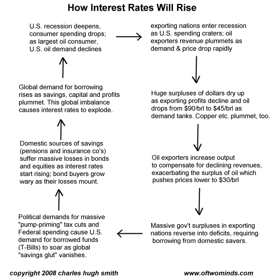 The Coming Destruction of U.S. Bonds (October 3, 2008) In the fantasy-world of market cheerleaders and "experts", interest rates will remain low indefinitely because the Fed will lower the Fed fund rate to near-zero. Nice, but the Fed doesn't control interest rates--the bond market does, and the bond market is set to reverse course, destroying the value of all existing bonds. Many observers, myself included, have long contended that all three asset classes--stocks, bonds and real estate--having risen in unison in the phony credit-bubble "prosperity" of the past decade, will also fall in unison. The housing bust has started--yes, only started--deflating the bubble-era valuations of both residential and commercial real estate, and global stock markets have already witnessed declines of between 20% and 65%. They are far from bottoming, too. Here is a chart which illustrates analyst Louise Yamada's view that the market is poised for a 50% decline along the lines of 1937's "echo bubble" collapse:
