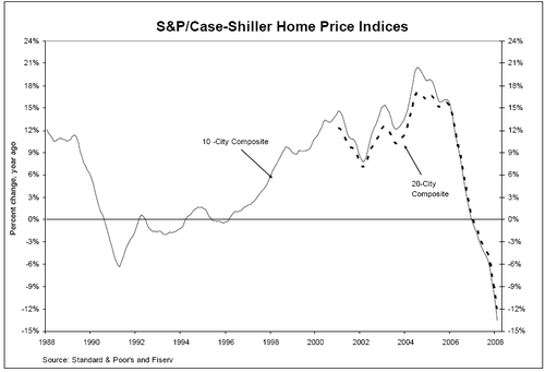 Now Mr. Mauldin is clearly a very smart, experienced individual, but it does seem as if he too has been seduced into believing that mortgages and MBS are just paper assets and can be adequately analyzed as such. But even if you naively think mortgages are merely paper assets, a glance at this chart should give you pause. This is why nobody wants that wonderful bundle of Alt-A loans, Mr. Mauldin: the risk is visibly incalculable. Other breathless accounts of vast profits just ahead for the "lucky taxpayers" footing the bill include heaping portions of gobblydegook about "senior tranches" and the like, all of which is purported to show how "the taxpayer really can't lose." Question: if all these toxic (i.e. essentially worthless) mortgages are such a great deal, then why aren't Gross, Bush, Bernanke, and Paulson rushing out to snap them up themselves? Whys isn't Hank liquidating his $700 million portfolio and buying up all these wonderful deals? In other words: if this debt was so risk-free and profitable, then private capital would already be snapping it up. These MBS are sitting unsold at 70 cents on the dollar and not even catching a bid at 55 cents on the dollar because private capital has made the intuitive assessment based on the following charts that there is a huge risk of losing most of your money trying to "catch the falling knife," i.e. buying residential real estate debt (mortgages) long before the bottom is finally hit.