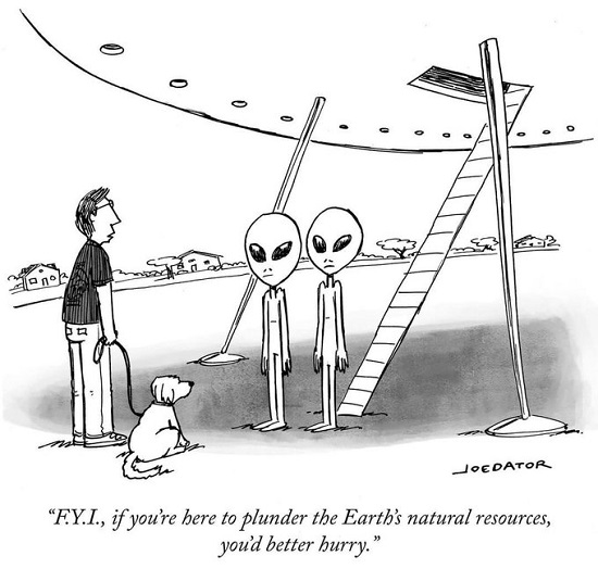 extract and 2) burning hydrocarbons is ruining the biosphere we all depend on, few humans think "gosh,