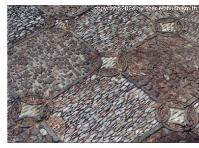 In many cases, the courtyard was constructed around a central feature, such as a pond or rock outcropping, which is viewed from an attendant villa; in others, smaller features such as narrow bridges, small-scale landscapes and stepping stones form a composition meant to be explored on foot. Eventually you notice how the paving design differs from courtyard to courtyard, and begin to marvel at the richness of the variations achieved on a geometric theme with the simplest of materials: dark gray clay bricks, pebbles, both smooth and rough, and gray roofing tiles set into the earth so only the crescent-shaped end is visible. In one pattern, thin gray bricks form six interlocking triangles filled with rough pebbles around hexagons of embedded smooth river rocks. In another, eight curved roofing tiles have been joined into a diamond- shaped design set inside a circle; each of these occupies a corner in a grid of squares, alternately filled with rough and smooth pebbles. Some designs are formal patterns of interlocking octagons and smaller squares; others are more organic designs, such as one of curved roofing tiles in a four-leaf-clover pattern surrounded by thin hand-laid fired clay rectangles which are also buried vertically.